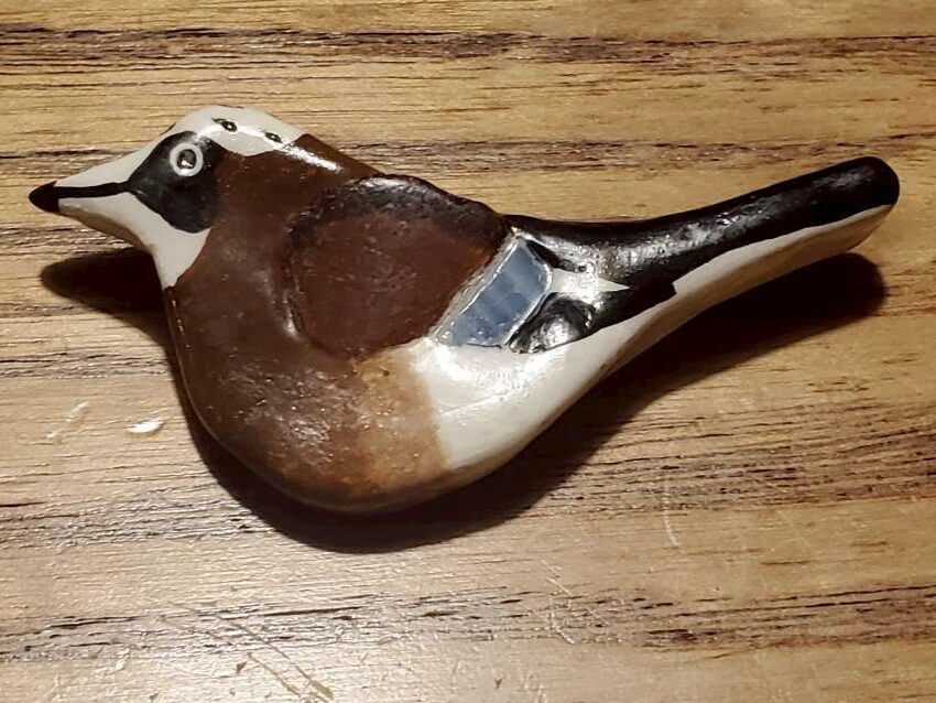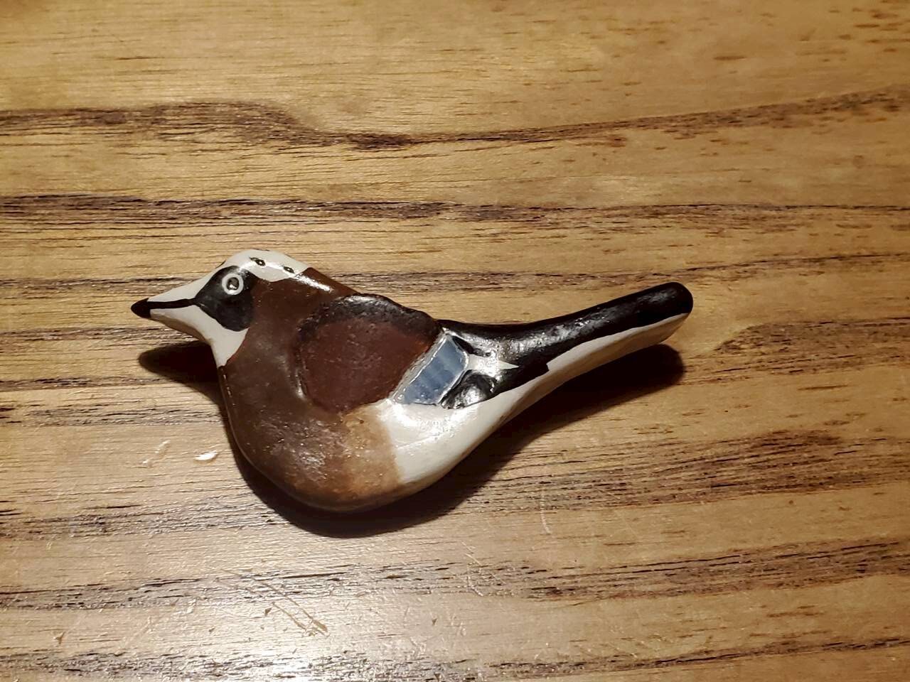 粘土とシーグラスまたはリバーグラスで羽根の部分を模した鳥のブローチ