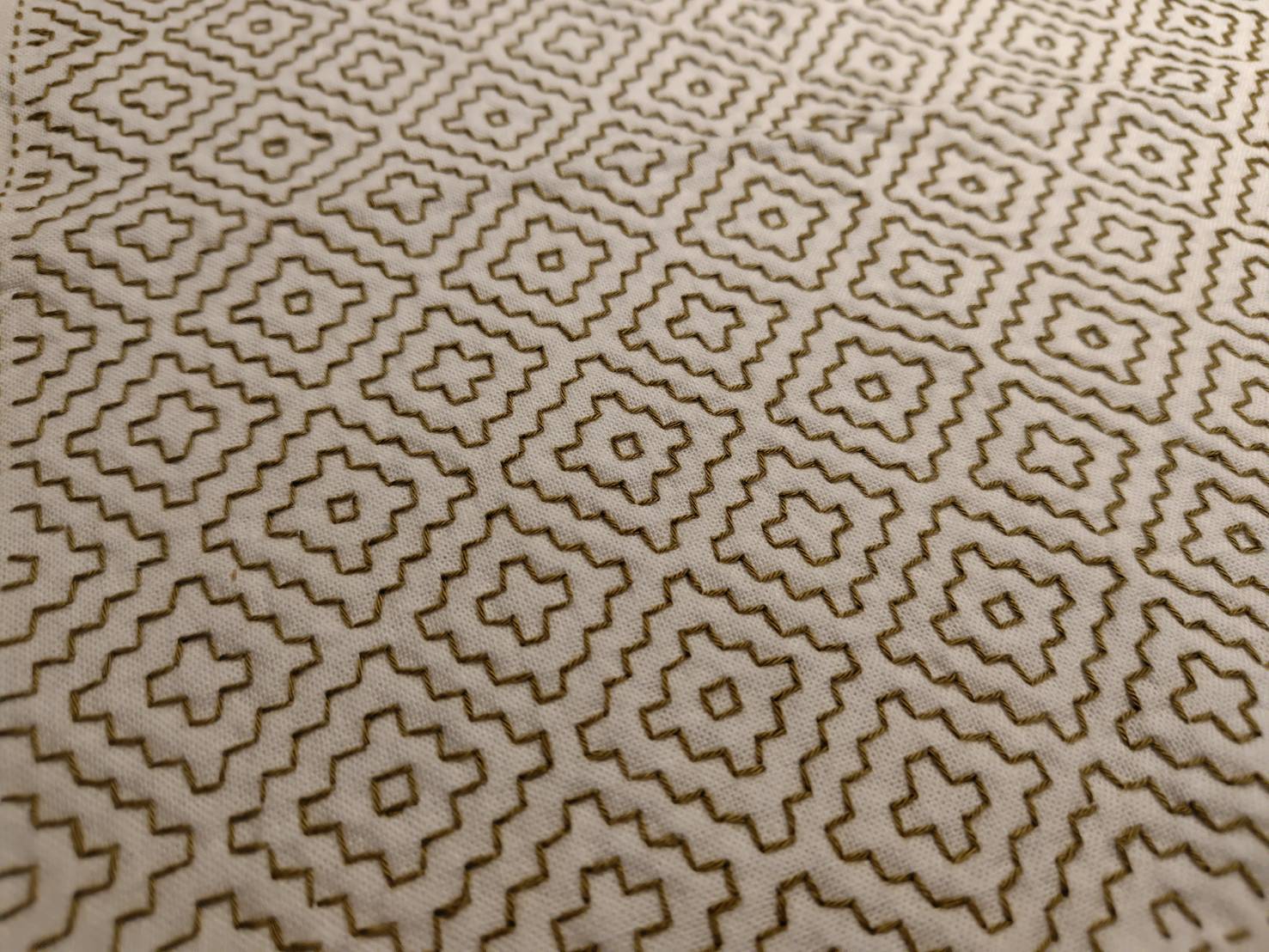 一目差し【柿の葉】を縫ってみた 刺繍 X Facebook はてブ LINE コピー 2025.09.19 柄に惹かれて柿の葉の模様に挑戦 用意したもの オリムパスの刺し子布 刺し子糸 針 糸切りバサミ 糸通し 並縫いしているだけなのに、模様が浮き出てくるところが面白い 進捗状況を姉に報告したところ、この柄飽きないの凄いね、と言われた… ということで完成〜 刺し終わったら水に浸けて下書きを消し、布を乾かしたら糸を切る 裏面なのにほぼ表面と同じ柄になるところが凄いぜ、柿の葉 みぞみぞする 手が寂しいときに無心になってできる刺し子、いいお供ですな