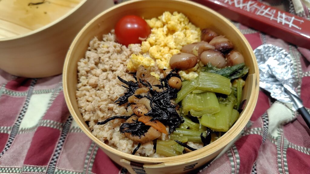手土産にお惣菜(煮豆、ほうれん草、ひじき煮)ももらい、翌日のお弁当に