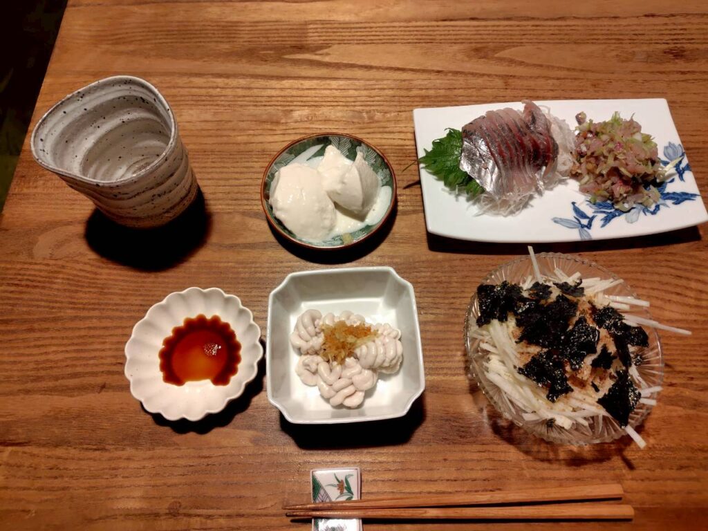 鯵刺は半分ネギと味噌を入れてたたき、なめろうに