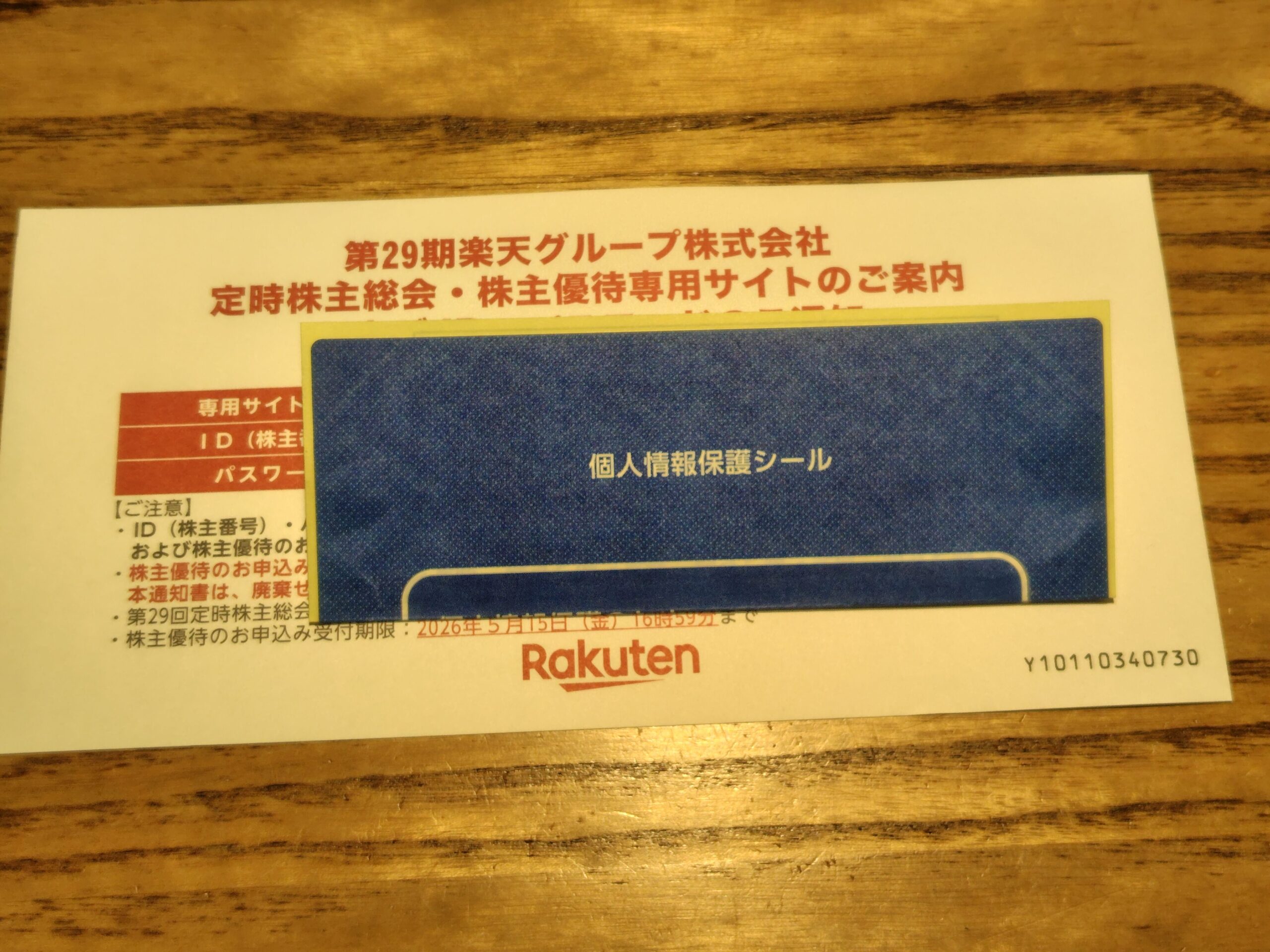 楽天モバイルの株主優待継続手続き 日記 X Facebook はてブ LINE コピー 2026.03.28 3月といえば そう、楽天グループの優待更新時期 今年はいつ来るかな〜と待っていた ふとポストに楽天グループの株主総会の案内が 特に何もないか、とスルーしていたところ、Xにて楽天モバイルの更新手続きをしたというポストが 株主総会の案内とともに同封されていた書類を確認してみると 株主優待専用サイトの案内が 所定の操作に従い、継続手続きを 特設ページを開き、ID(株主番号)とパスワードを入力 無事に継続手続きを終えたのであった…