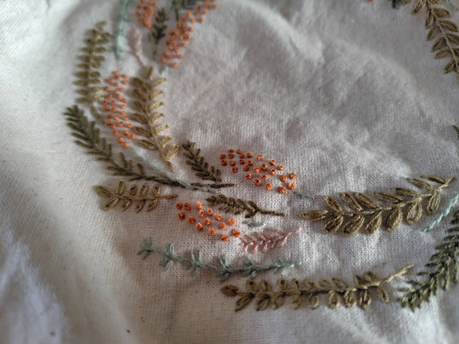 こんな感じのセリアで買ってあった糸(色は違う)を使って葉っぱから刺繍開始